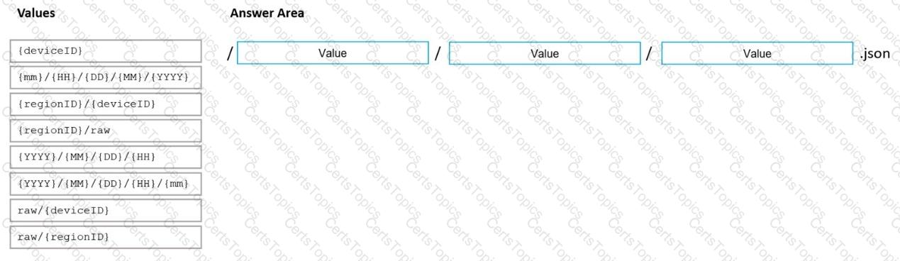 You are designing an Azure Data Lake Storage Gen2 structure for telemetry data from 25 million devices distributed across seven key geographical regions. Each minute, the devices will send a JSON payload of metrics to Azure Event Hubs.