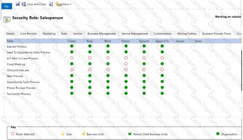 The founder has edited the Salesperson security role to allow the carer to use the Corgi meet-up business process flow, as shown in the following