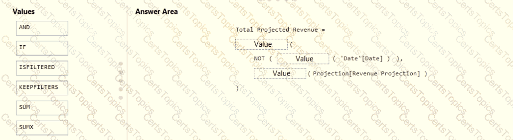 How should you complete the measure? To answer, drag the appropriate values to the correct targets. Each value may be used once, more than once, or not at all. You may need to drag the split bar between panes or scroll to view content.