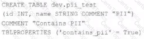 The data governance team has instituted a requirement that all tables containing Personal Identifiable Information (PH) must be clearly annotated. This includes adding column comments, table comments, and setting the custom table property " contains_pii " = true .