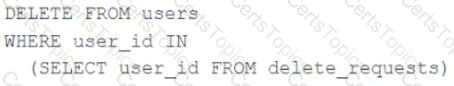 Assuming that user_id is a unique identifying key and that delete_requests contains all users that have requested deletion, which statement describes whether successfully executing the above logic guarantees that the records to be deleted are no longer accessible and why?