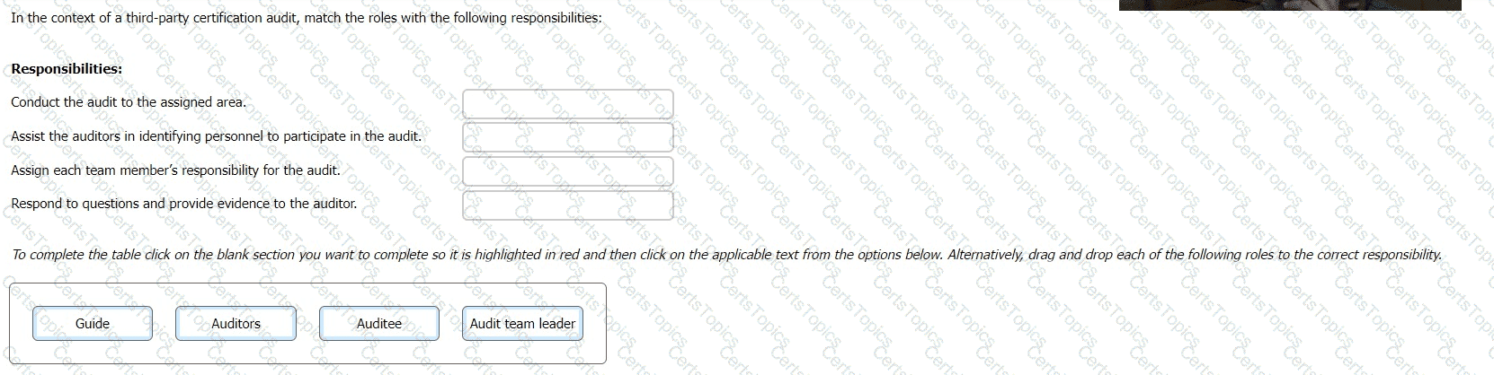In the context of a third-party certification audit, match the roles with the following responsibilities:
