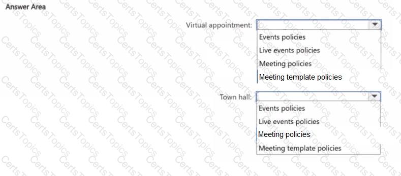 Which policies should you configure in the Microsoft Teams admin center for each feature? To answer, select the appropriate options in the answer area.