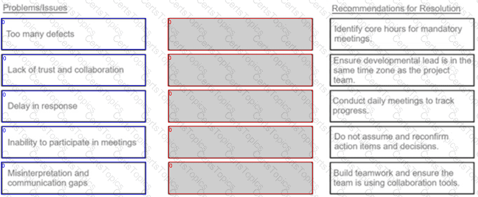 All the developers on a project team are working offshore in a different time zone, resulting in many issues. Match the issues to the agile practitioner's recommendations for resolutions below. (Drag the Problems/Issues on the left to the box in the center, corresponding to the correct Recommendations for Resolution on the right)