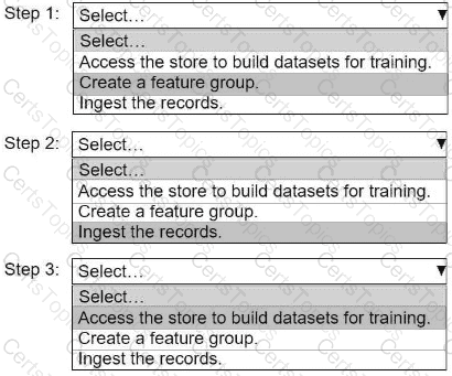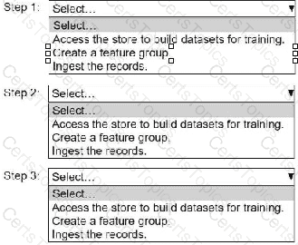 Select and order the steps from the following list to create and use the features in Feature Store. Each step should be selected one time. (Select and order three.)