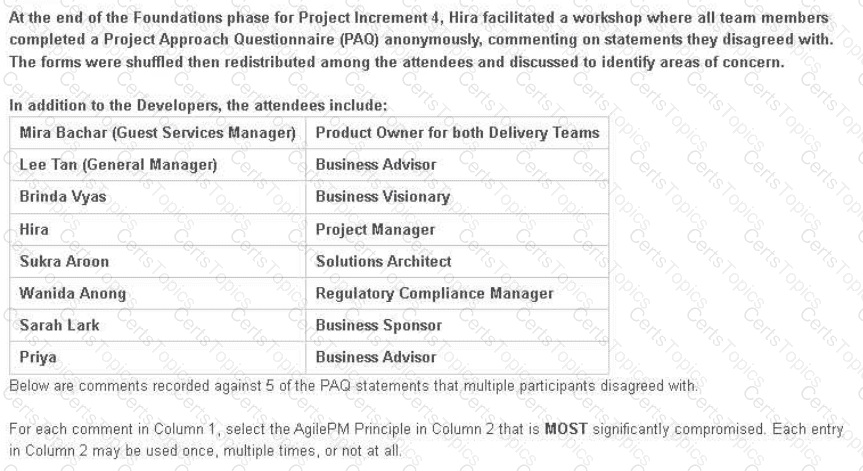 Here the task is to identify which AgilePM principle is most significantly compromised in each case, based on the behavior or concern described.