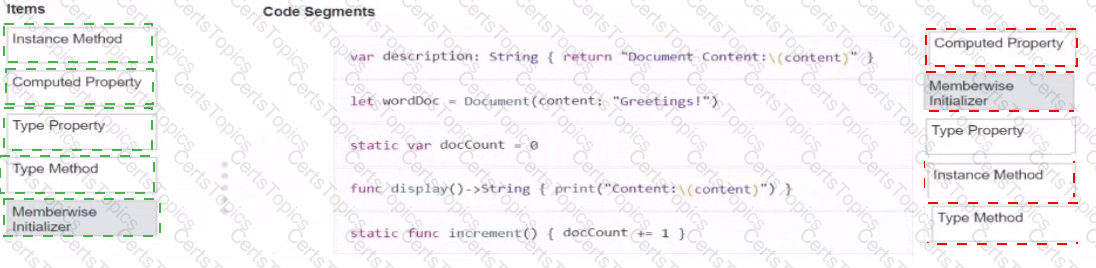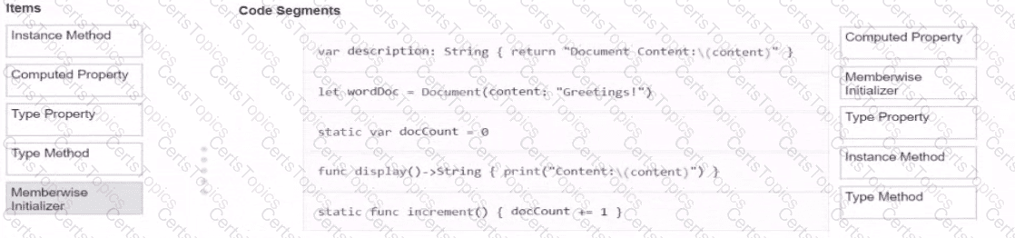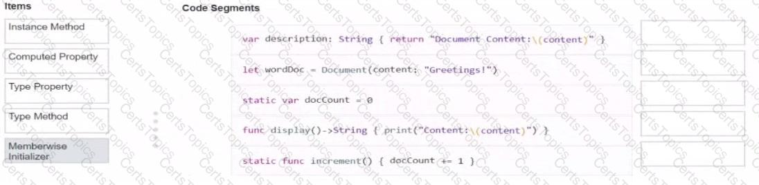 Move each item from the list on the left to the correct code segment on the right. You may use each item only once.