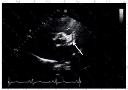 Which condition is most plausible based on the finding indicated by the arrow on this image?