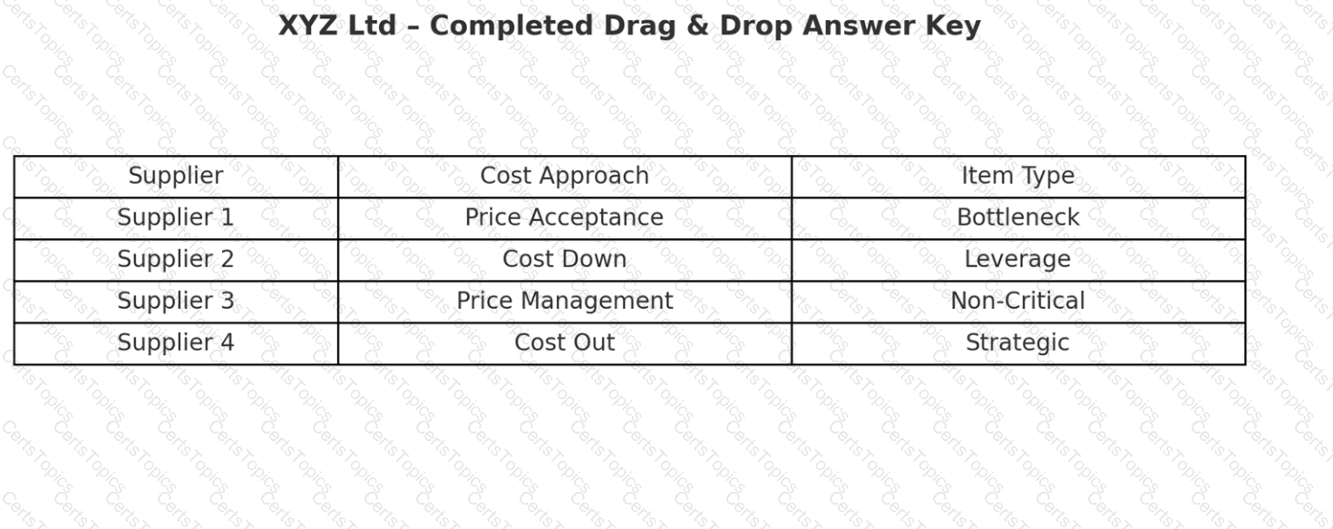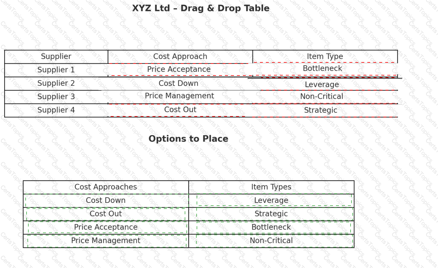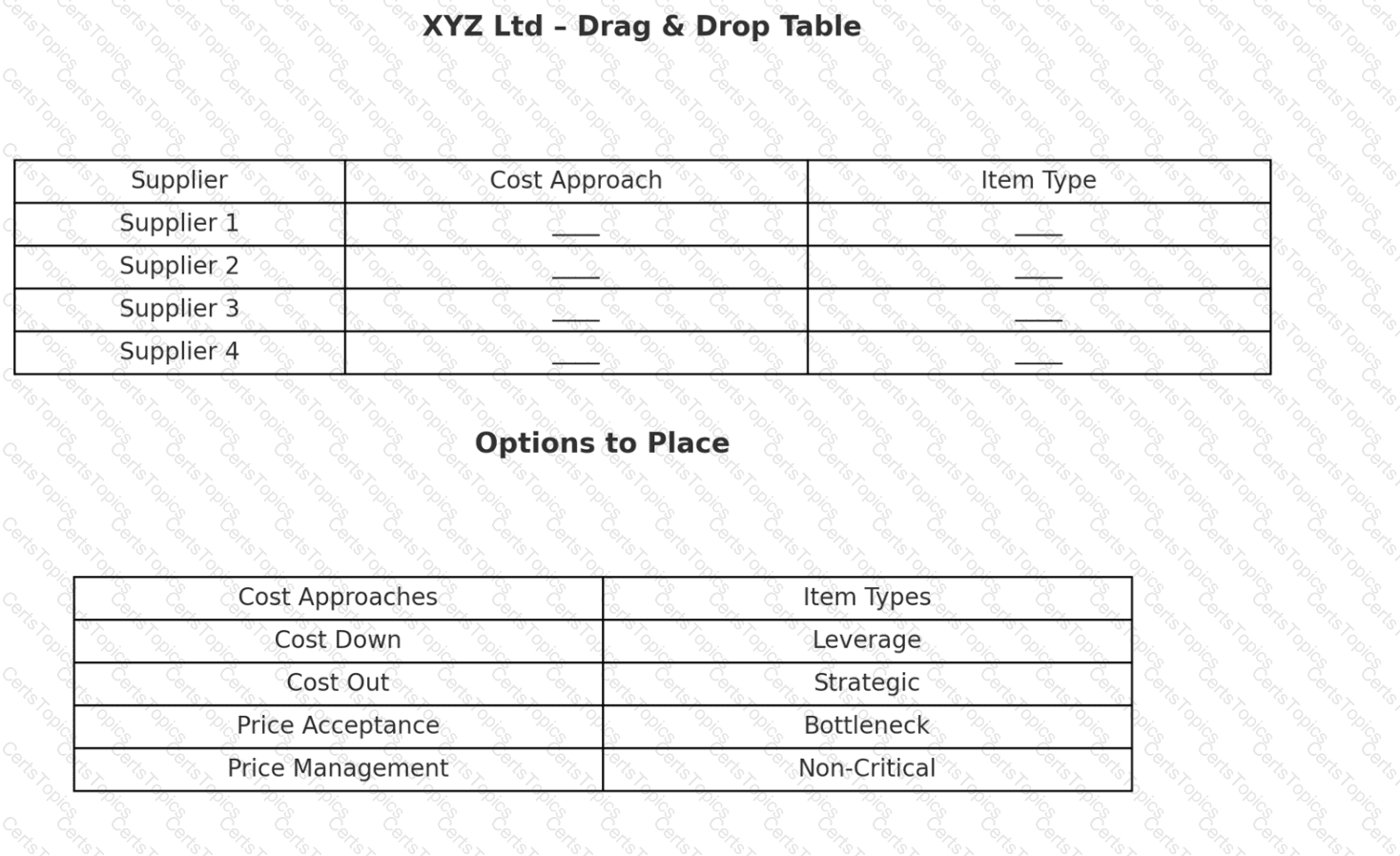 Complete the table below. You are required, for each supplier, to determine the Cost Approach taken by XYZ Ltd and to identify the Item Type based on the Kraljic Matrix. Each response should only be used once.