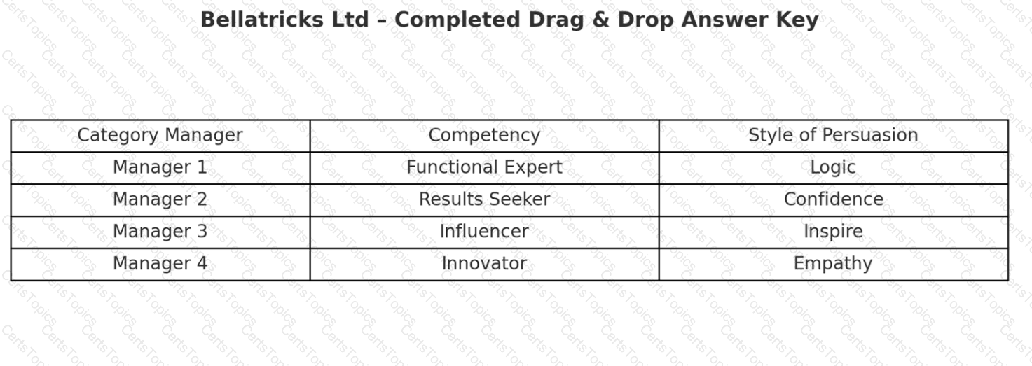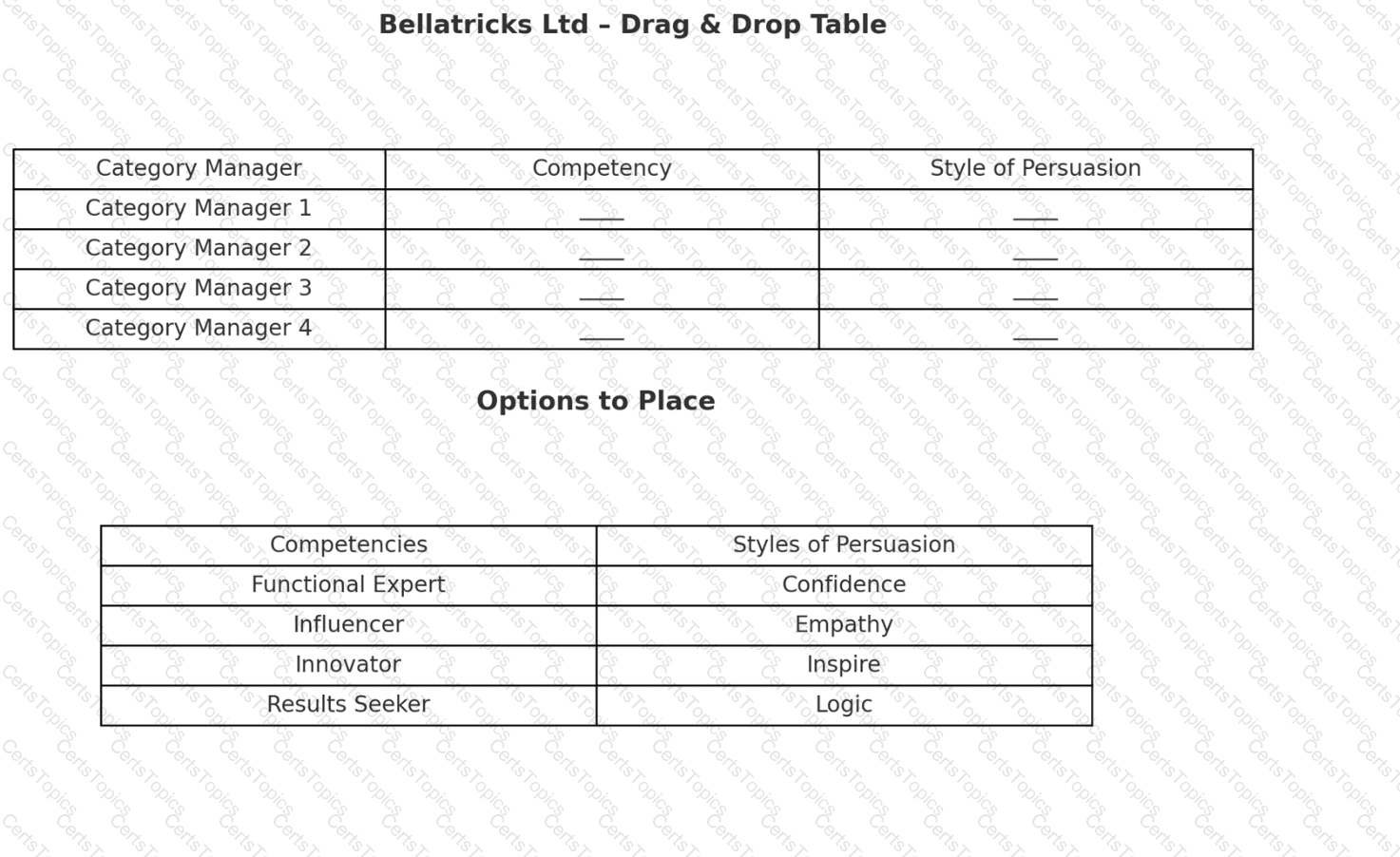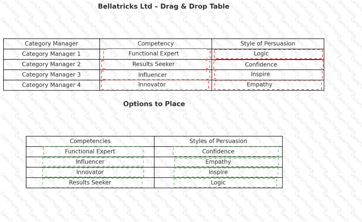 Complete the table by identifying each Category Manager’s competency and style of persuasion when negotiating with suppliers. Each response should only be used once.