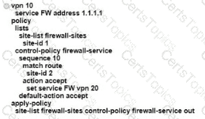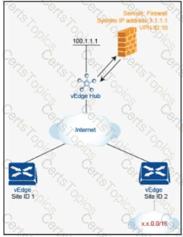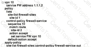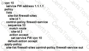 An engineer is configuring service chaining. Which set of configurations is required for all traffic from Site ID 1 going toward Site ID 2 to get filtered through the firewall on the hub site?
