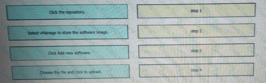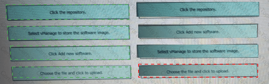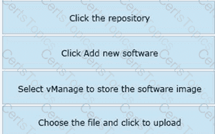 Drag and drop the steps from the left into the order on the right to upload software on vManage repository that is accessible from maintenance > Software Repository.