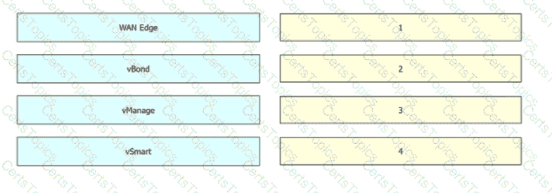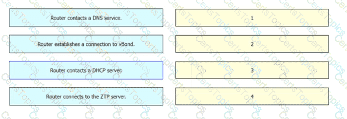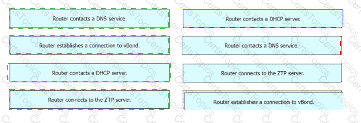 Drag and drop the steps from the left into the sequence on the right for a WAN Edge router after powering on for zero touch provisioning.