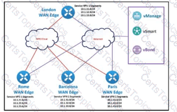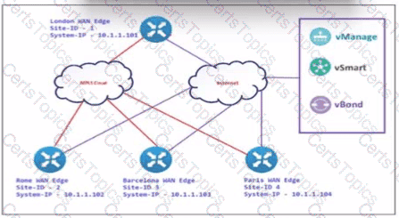 The SD-WAN network is configured with a default full-mash topology. An engineer wants Barcelona and Paris to communicate to each other through the London site using a control Which control policy configuration accomplishes the task?