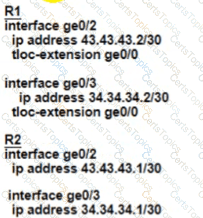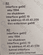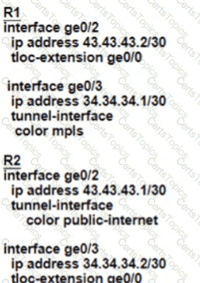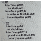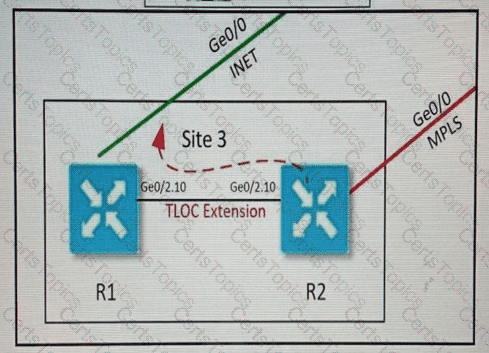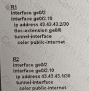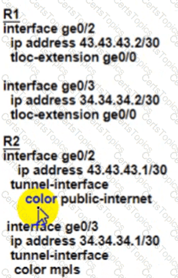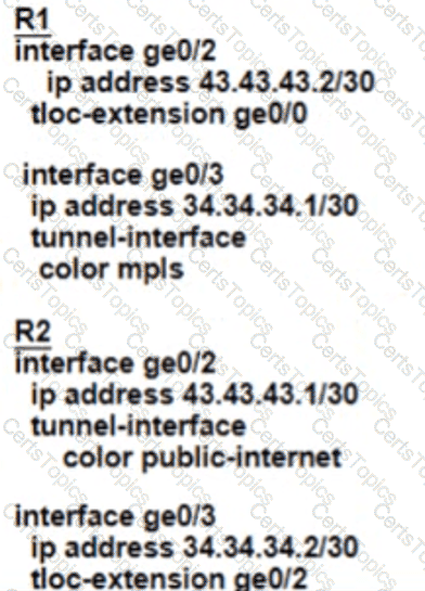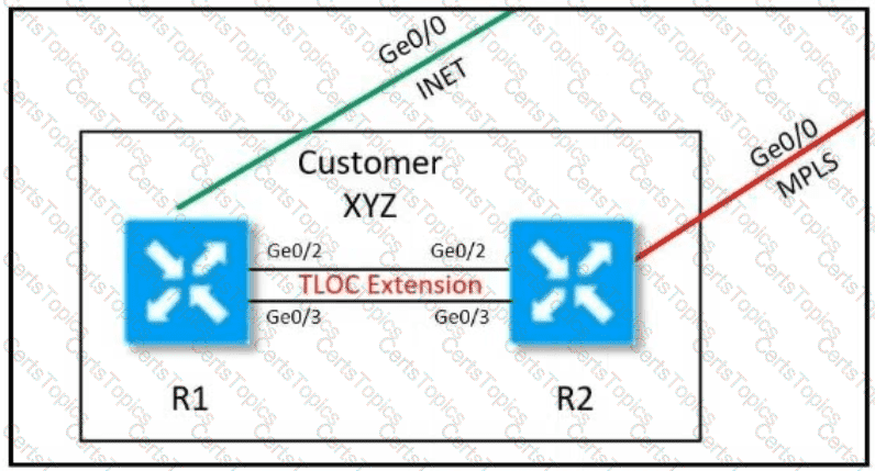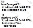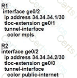 An MPLS connection on R2 must extend to R1 Users behind R1 must have dual connectivity for data traffic Which configuration provides R1 control connectivity over the MPLS connection?