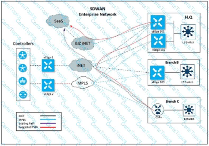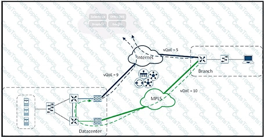 Refer to the exhibit. A user in the branch is connecting to Office 365 for the first time. Over which path does the branch WAN Edge router traffic follow?