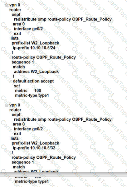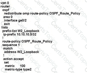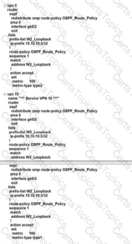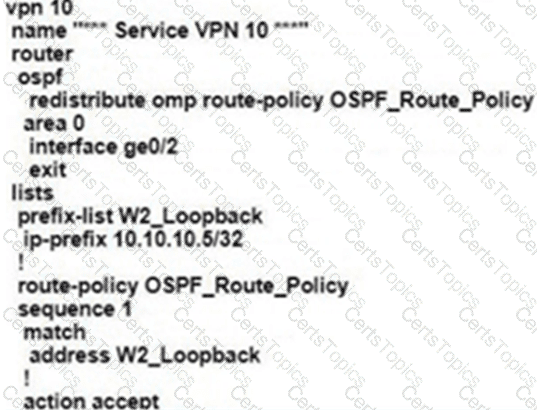 A customer is receiving routes via OMP from vSmart controller for a specific VPN. The customer must provide access to the W2 loopback received via OMP to the OSPF neighbor on the service-side VPN, which configuration fulfils these requirements?
