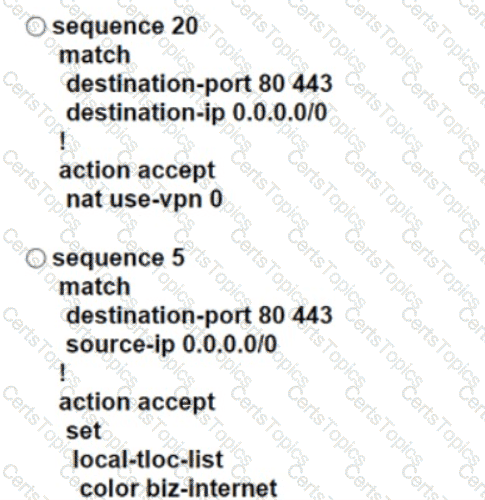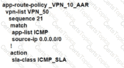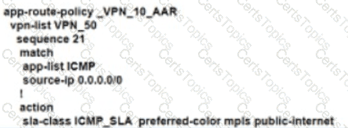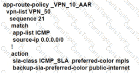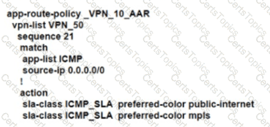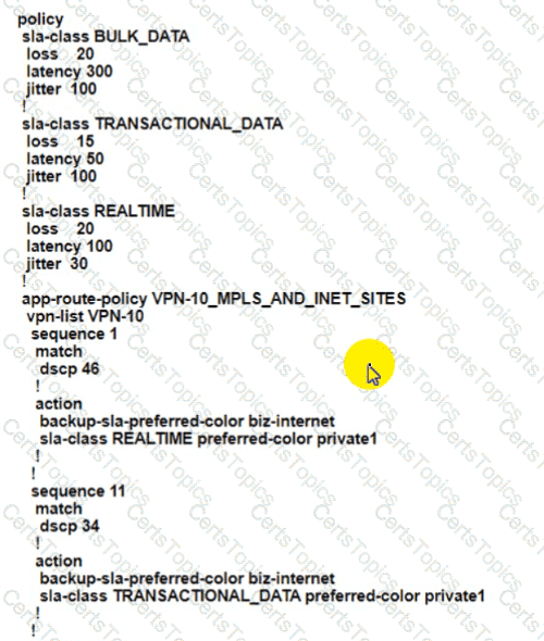 An engineer configures an application-aware routing policy for a group of sites The locations depend on public and private transports The policy does not work as expected when one of the transports does not perform properly This policy is configured: