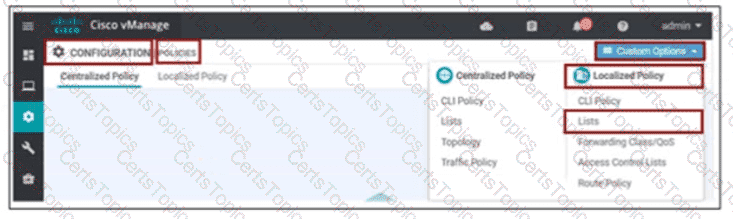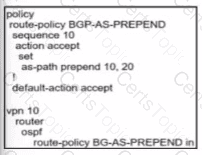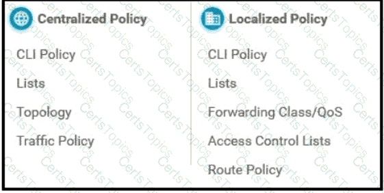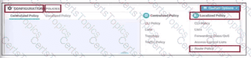 Refer to the exhibit. The network administrator has configured a centralized topology policy that results in the displayed routing table at a branch office. Which two configurations are verified by the output? [Choose two.)