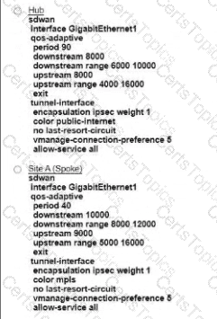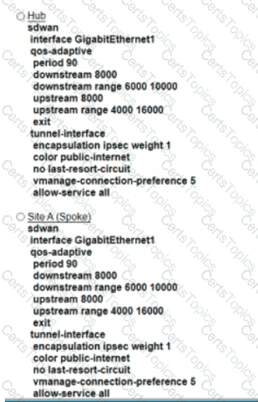 Refer to the exhibit An engineer must configure a QoS policy between me hub and site A (spoke) over a standard internet circuit where traffic shaping is adjusted automatically based on evaiiabk» bandwidth Which configuration meets the requirement?