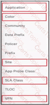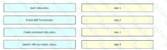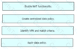 Drag and drop the actions from the left into the correct sequence on the right to create a data policy to direct traffic to the Internet exit.