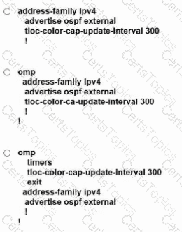 An engineer must advertise OSPF-learned routes and modify the update interval for route filtering by TLOC color to 300 on an SD-WAN device. Which configuration accomplishes this