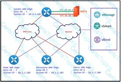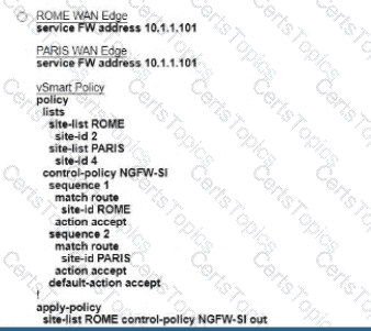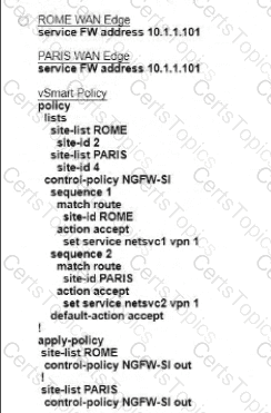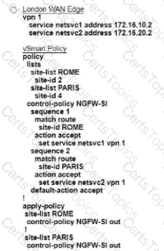 Refer to the exhibit. The Cisco SD-VYAN is deployed using the default topology. The engineer v/ants to configure a service insertion policy such that all data traffic between Rome to Paris is forwarded through the NGFW located in London. Which configuration fulfills this requirement, assuming that the Sen/ice VPN ID is 1?