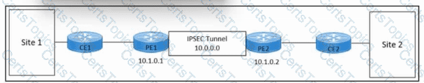 Refer to the exhibit. An engineer must configure an IPsec VPN connection between site 1 and site 2. The ISAKMP policy for the phase 1 negotiations of the tunnel must use AES and SHA-256. This configuration was applied to both PE routers; however, the tunnel fails to come up:
