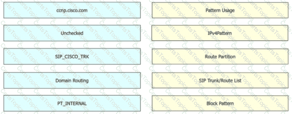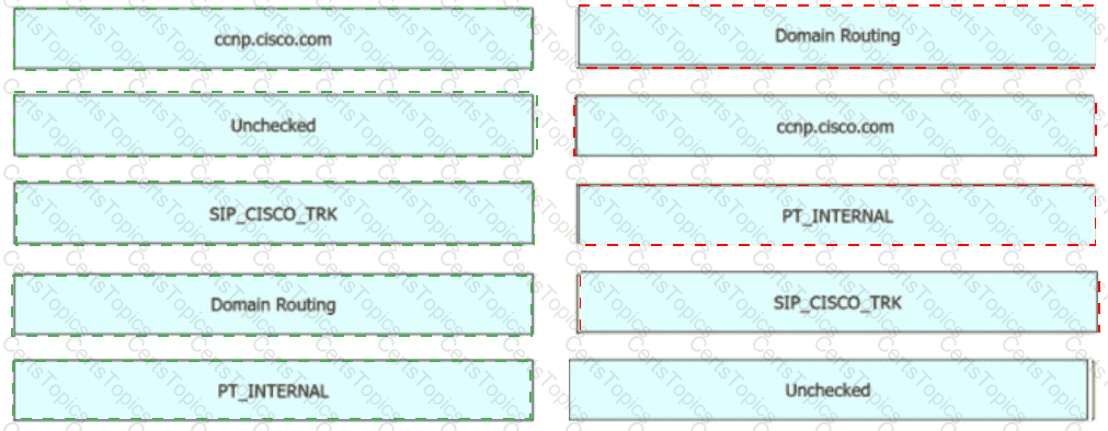 In Cisco UCM, an engineer must create a new SIP route pattern to allow ccnp.cisco com for all internal callers The internal callers have a calling search space named CSSJNTERNAL that includes the partition named PTJNTERNAL If allowed, the calls must be routed to a SIP trunk named SIP_CISCO_TRK. Drag and drop the values from the left onto the corresponding fields on the right.