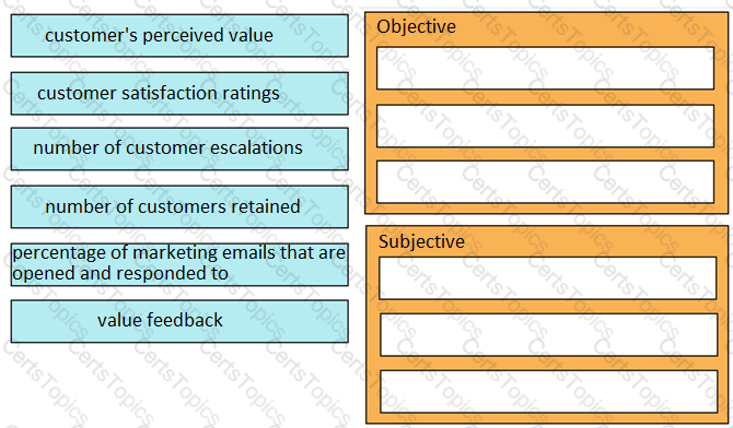 The Customer Success Manager is preparing for a review meeting. The customer has asked for a balance between subjective and objective metrics. Drag and drop the inputs from the left onto the correct subjective and objective categories on the right.