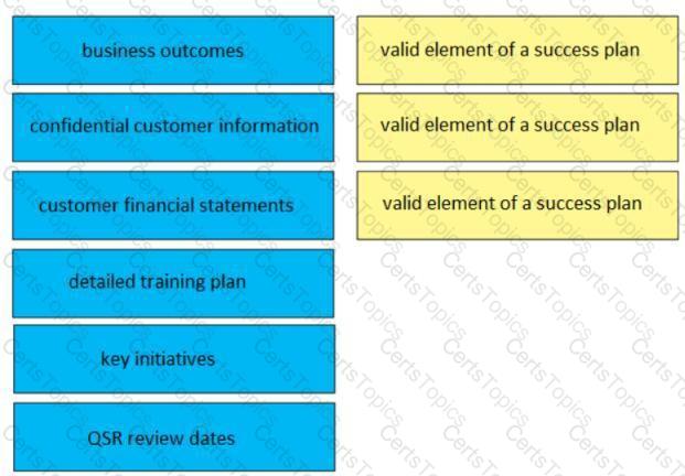 Drag and drop three valid elements of a success plan from the left to the right. Not all options are used. Select and Place: