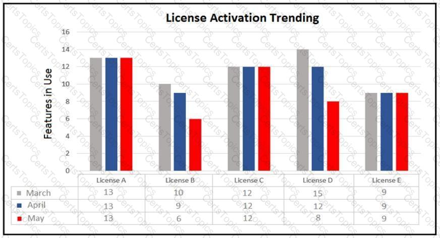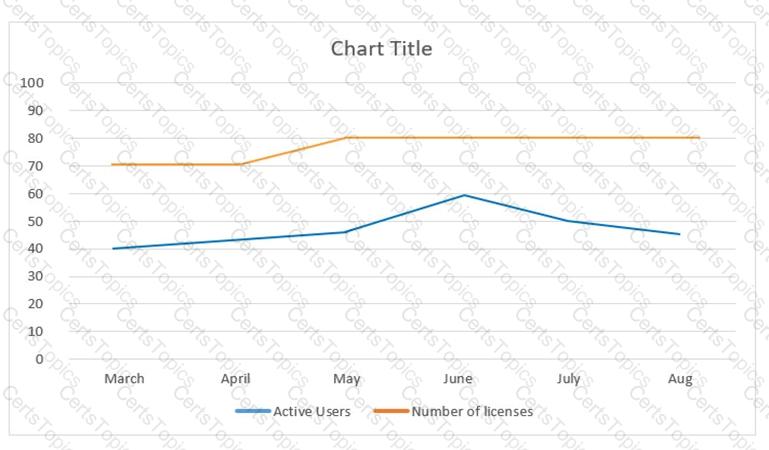 The graph shows a customer with a software product and highlights the number of paid-for licenses (shown with the orange line) and the number of users actively using the product (shown with the blue line). Which statement about the customer is true?