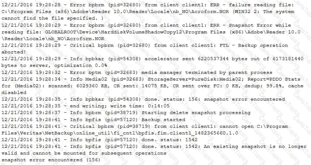 An administrator has a MS-Windows type policy that has failed for a Microsoft Windows NetBackup client. The policy uses the ALL_LOCAL_DRIVES backup selection. See the extract from the end of the job details below:
