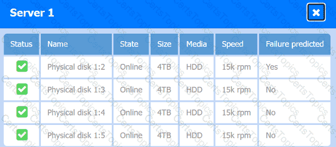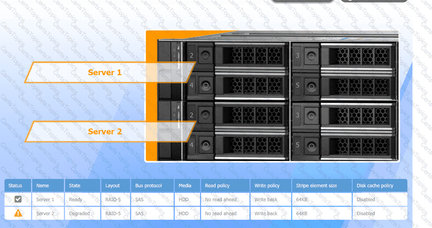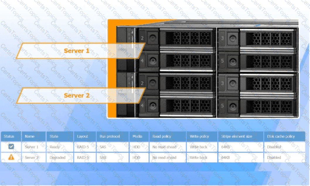 The degraded status on Server 2 indicates a RAID-5 issue, typically due to a failed or failing drive. In RAID-5 configurations, when one drive fails, the system can still operate but with reduced performance as parity data is used to rebuild missing data on-the-fly.