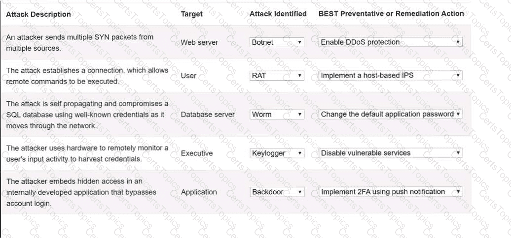 Select the appropriate attack and remediation from each drop-down list to label the corresponding attack with its remediation.