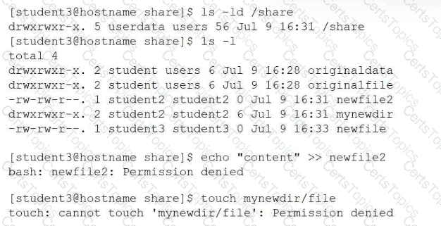 A systems administrator receives reports from users who are having issues while trying to modify newly created files in a shared directory. The administrator sees the following outputs: