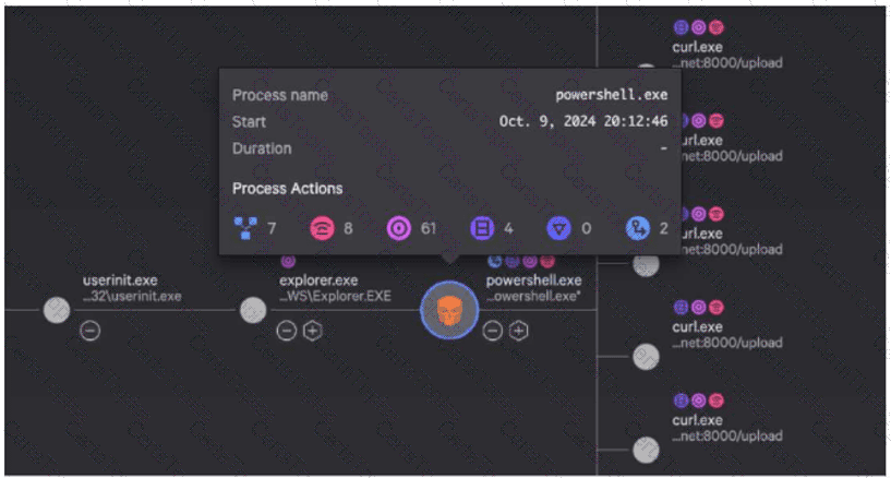 While investigating a process tree, you hover over a malicious powershell.exe process. What is the correct sequence of Process Actions?