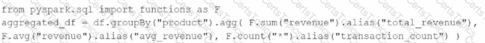 A data engineer has been provided a PySpark DataFrame named df with columns product and revenue. The data engineer needs to compute complex aggregations to determine each product's total revenue, average revenue, and transaction count.