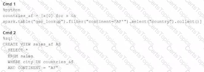 A junior member of the data engineering team is exploring the language interoperability of Databricks notebooks. The intended outcome of the below code is to register a view of all sales that occurred in countries on the continent of Africa that appear in the geo_lookup table.
