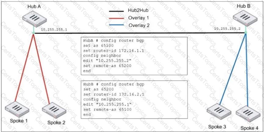 Refer to the exhibit, which shows the ADVPN IPsec interface representing the VPN IPsec phase 1 from Hub A to Spoke 1 and Spoke 2, and from Hub В to Spoke 3 and Spoke 4.