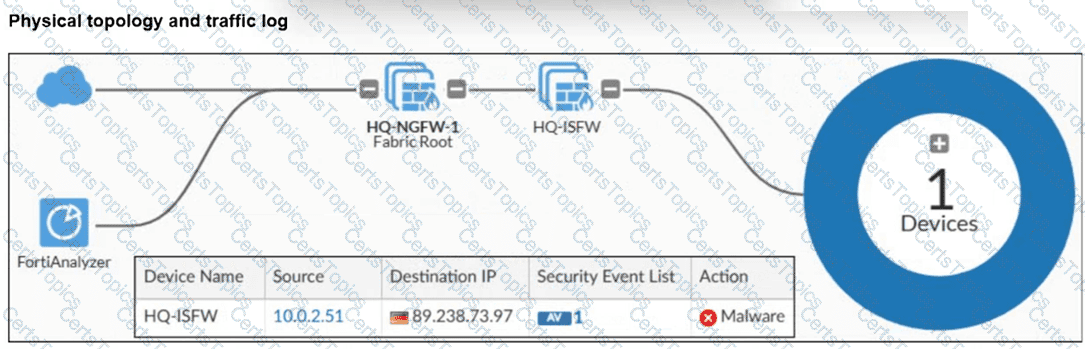 A physical topology along with a traffic log is shown. You are using FortiAnalyzer to monitor traffic from the device with IP address 10.0.2.51, which is located behind the FortiGate internal segmentation firewall (ISFW) device. Unified threat management (UTM) is not enabled in the firewall policy on the HQ-ISFW device, and you are surprised to see a log with the action Malware, as shown in the exhibit. What are two reasons why FortiAnalyzer would display this log? (Choose two answers)