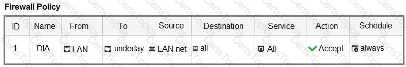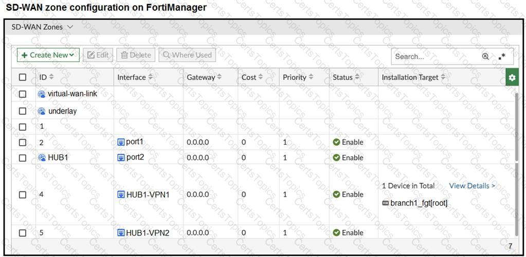 The FortiGate devices are managed by ForliManager, and are configured for direct internet access (DIA). You confirm that DIA is working as expected for each branch, and check the SD-WAN zone configuration and firewall policies shown in the exhibits.