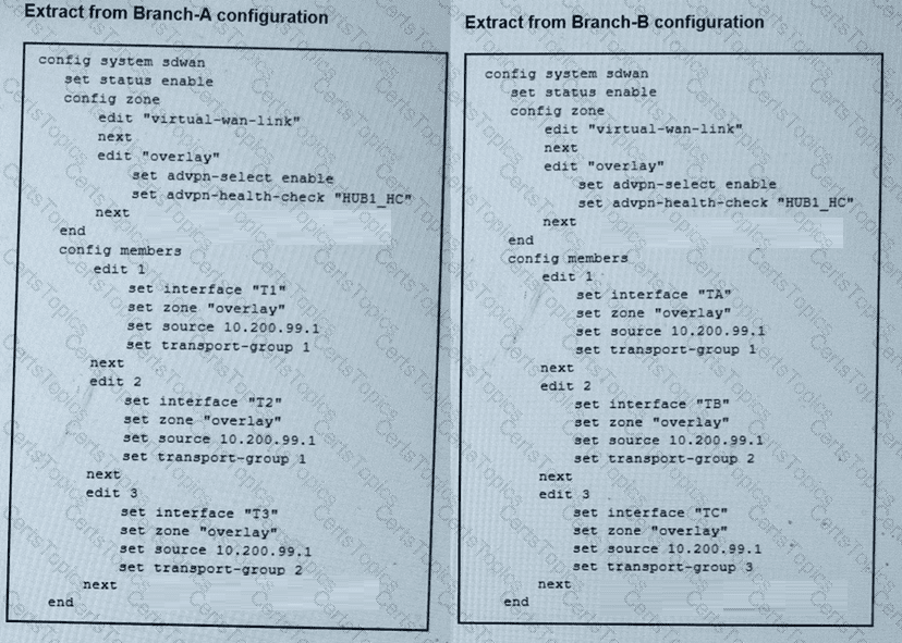 The SD-WAN zones and members configuration of two branch devices are shown. The two branch devices are part of the same hub-and-spoke topology and connect to the same hub. The devices are configured to allow Auto-Discovery VPN (ADVPN). The configuration on the hub allows the initial communication between the two spokes.