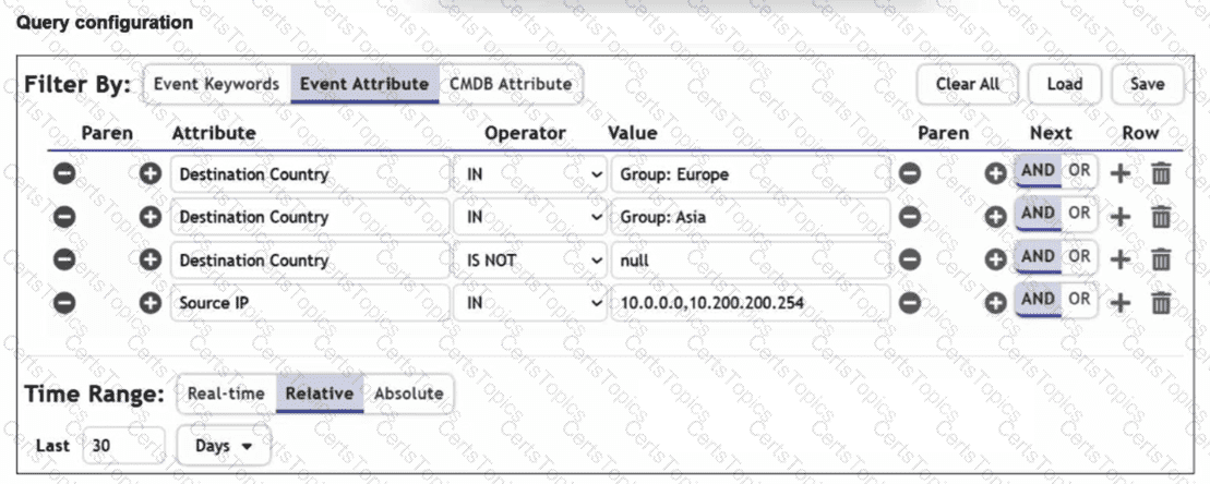 You are trying to find traffic flows to destinations that are in Europe or Asia, for hosts in the local LAN segment. However, the query returns no results. Assume these logs exist on FortiSIEM.