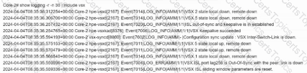 2024-04-04T08:35:38.312254+00:00 ICX-Core-1 hpe-vaxd[2167]: Event[701|LOG_INFO|AMM1/1|VSX2 state local up, remote down]