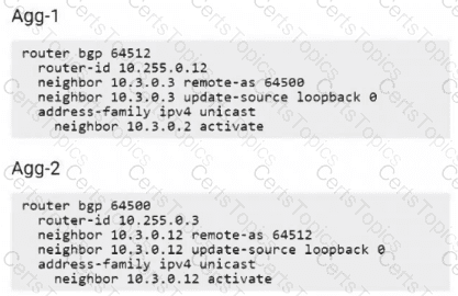 A junior engineer has configured eBGP between two CX switches (Agg-1 and Agg-2) using the configuration below, and tells you that the neighbors are in the ‘Active’ state.