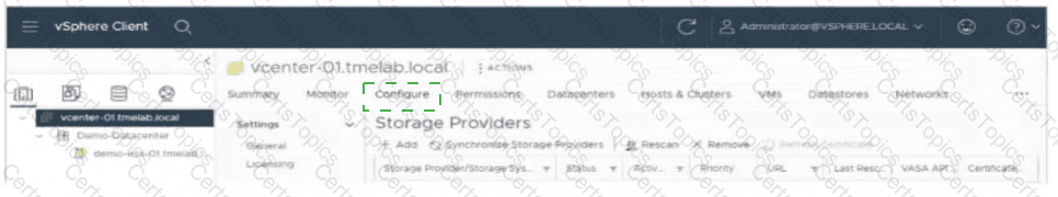 An administrator needs to verify that the HPE plug-in was installed in VMware vCenter to correctly integrate with the HPE Alletra storage array. Use your cursor to place a + where the administrator can click to verify the plug-in installation.