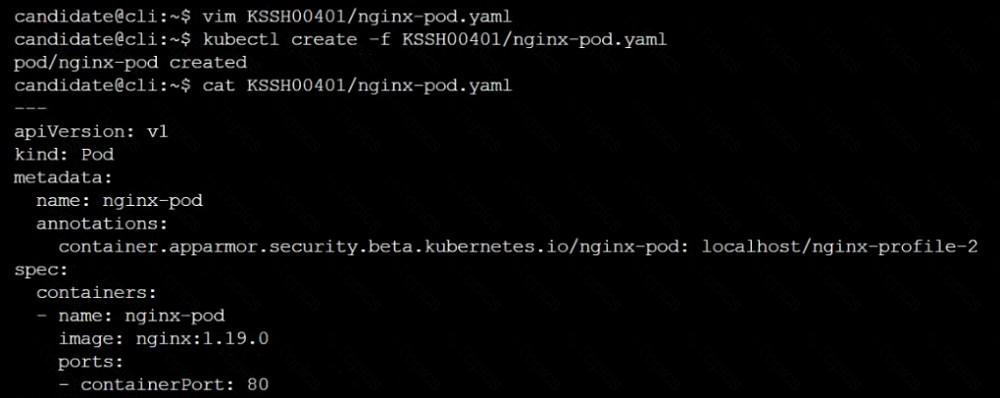 Edit the prepared manifest file located at /home/candidate/KSSH00401/nginx-pod.yaml to apply the AppArmor profile.