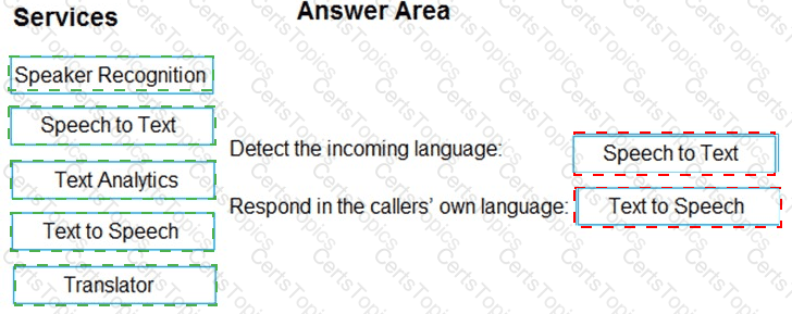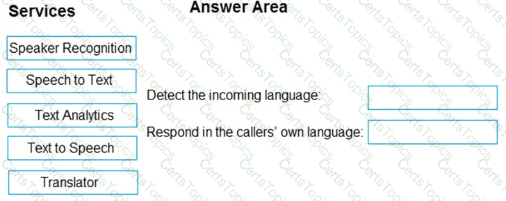 Which Azure Cognitive Services service should you use to meet each requirement? To answer, drag the appropriate services to the correct requirements. Each service may be used once, more than once, or not at all. You may need to drag the split bat between panes or scroll to view content.