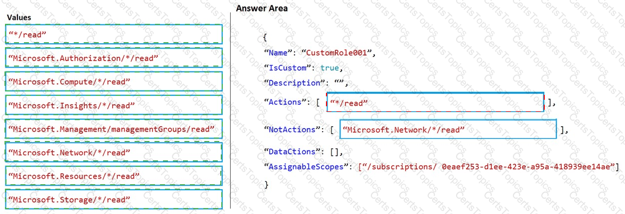 How should you configure the role-based access control (RBAC) role definition? To answer, drag the appropriate values to the correct targets. Each value may be used once, more than once, or not at all. You may need to drag the split bar between panes or scroll to view content.